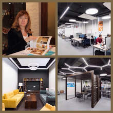 На первый план выходит клиентская зона, ресепшн, переговорная - посетители сразу попадают в комфортное пространство, организованное специально для них, при этом они не мешают сотрудникам заниматься своей обычной деятельностью и никого не отвлекают. В глубине офиса расположены территории для отдыха и общения, где можно пообедать или просто отдохнуть и поговорить с коллегами. Они зонированы и отделены друг от друга, поэтому разные группы людей не будут мешать друг другу. Рабочие места расположились посередине. Подобная организация является эргономичной - все необходимое находится в обозримой близости, зоны удобно расположены. Такая система напоминает коворкинг, поскольку сотрудники могут работать самостоятельно, но вместе с тем, присутствует атмосфера общности и дружественного коллектива, которая благоприятно влияет на творческий процесс.